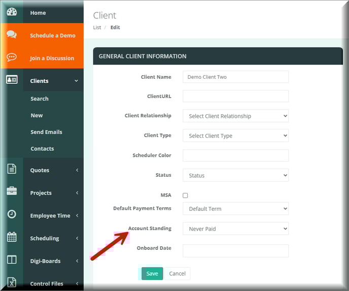 Now that you have your Client Account Standings setup you can assign a client to those. You can review our Editing a Client article for more information on how to specifically edit a client. Once you are on your Client Edit page you can find the field for "Account Standing" and pick the appropriate standing.