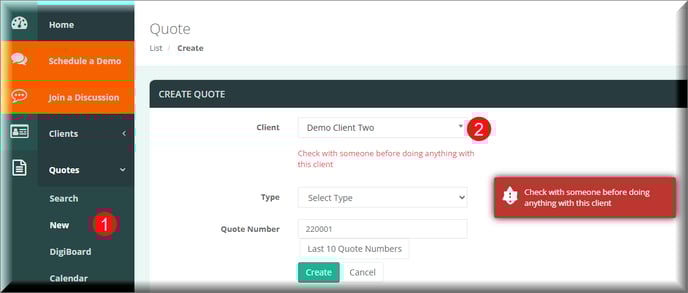 Now when you create a Quote or a Project for this client you will get a message referring to the client's Account Standing.