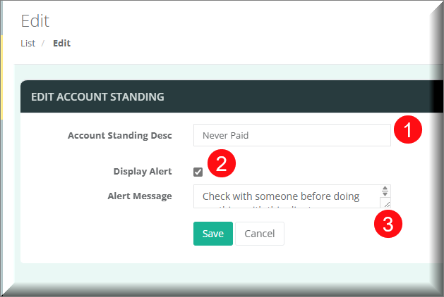 From there you can manage your list of Client Account Standings adding new and editing existing as needed. When editing a Client Standing there are several fields to be aware of: