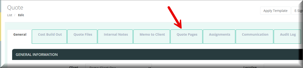 Quote Pages are available from the Quote Edit page. It is an option on a tab as shown in the screenshot below: