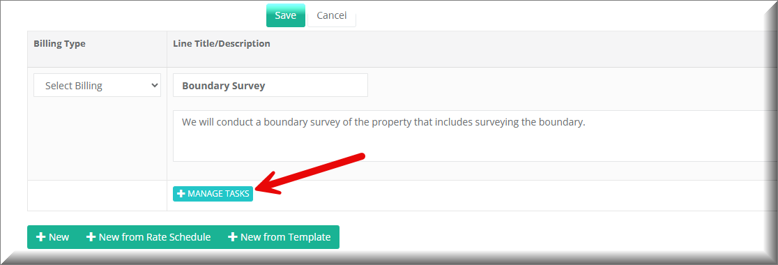 The first step in adding a quote task to a quote is to find your quote. Once you have found your quote go to the quote line items section and there you will see a button for "Manage Tasks". Click that button as shown on the screenshot below.